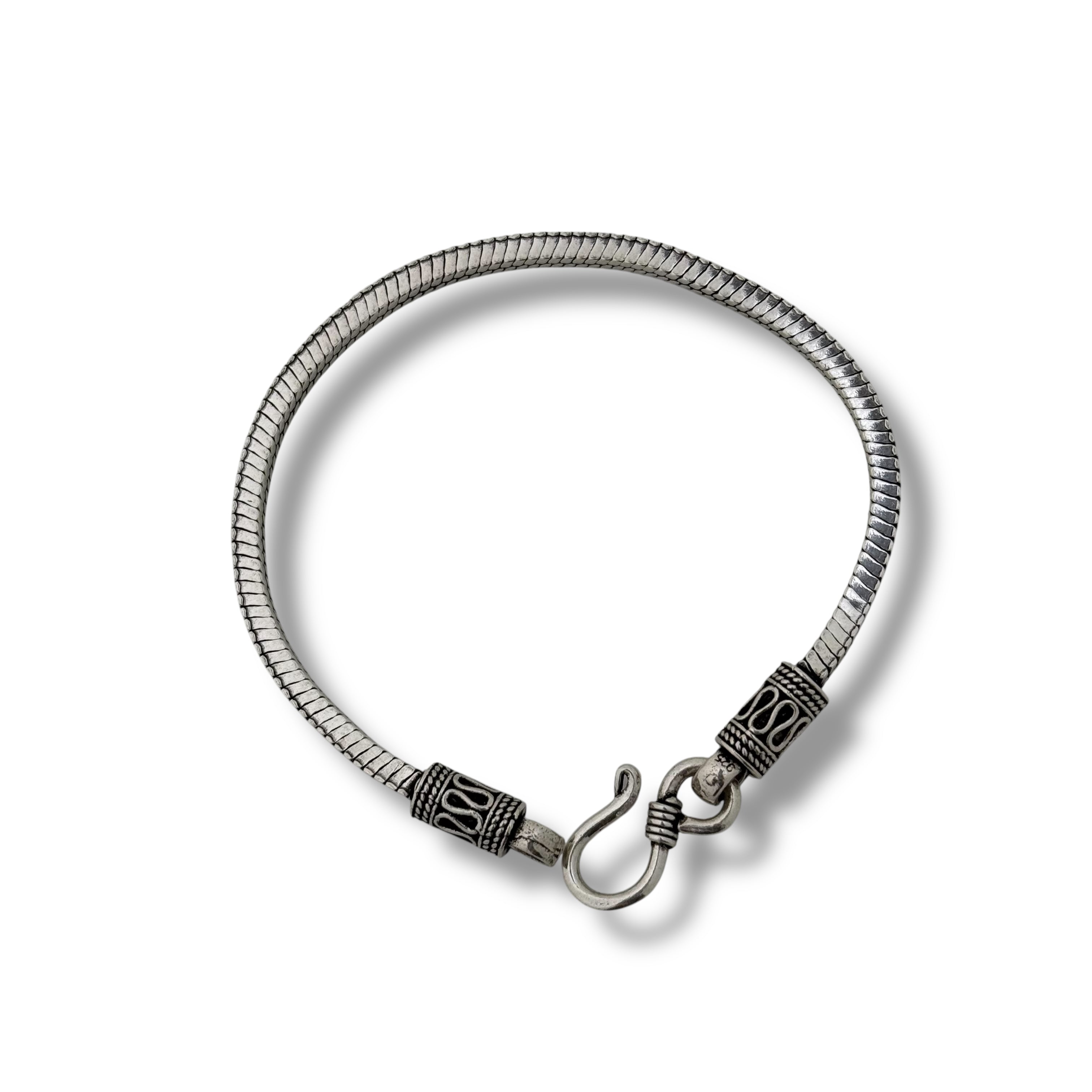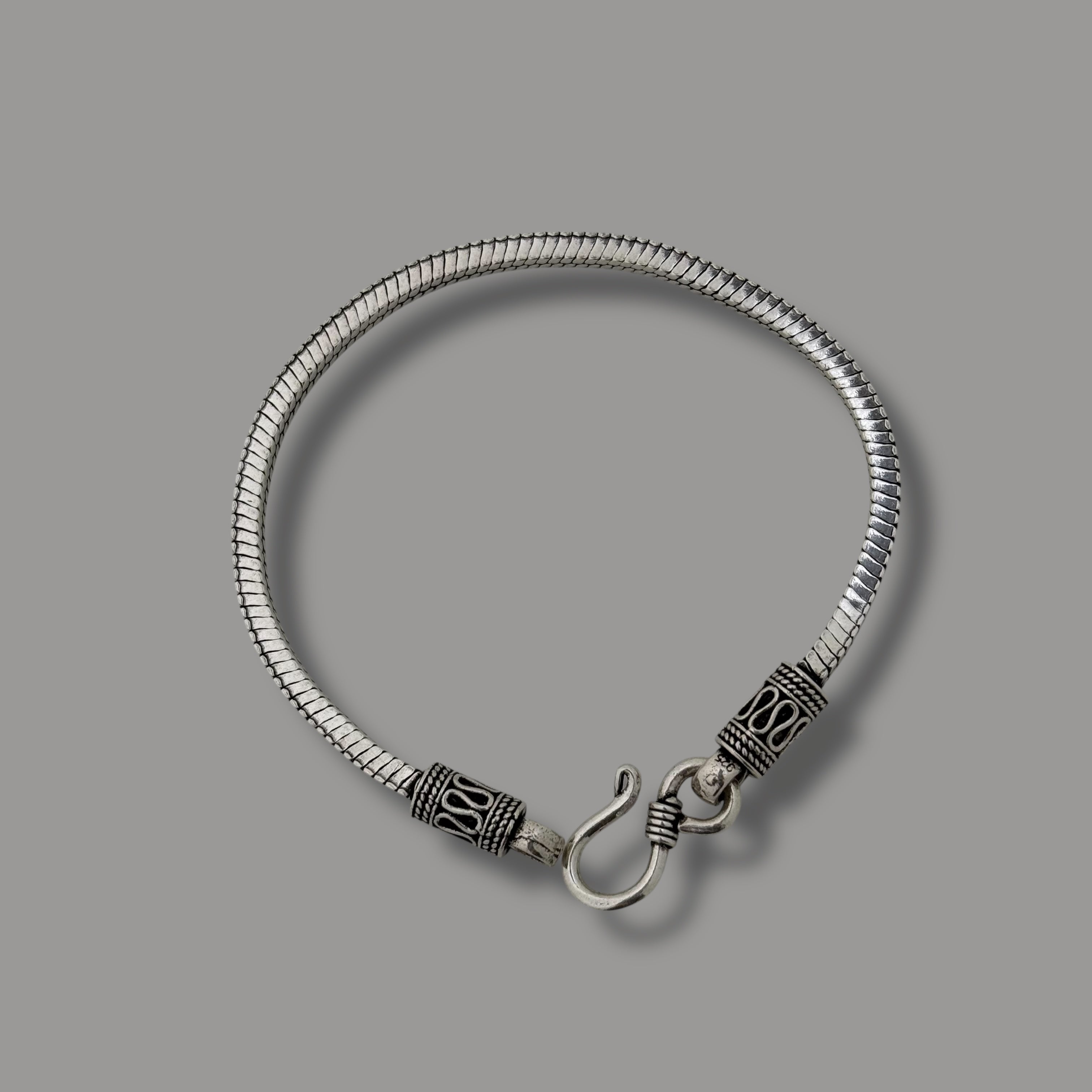 Distinctive and sleek, this men’s bracelet is crafted from pure 925 sterling silver and weighs 16 grams. The thick snake chain design and oxidised engraved end caps offer a modern yet rugged look, paired with a sturdy ethnic hook clasp for secure everyday or festive wear.