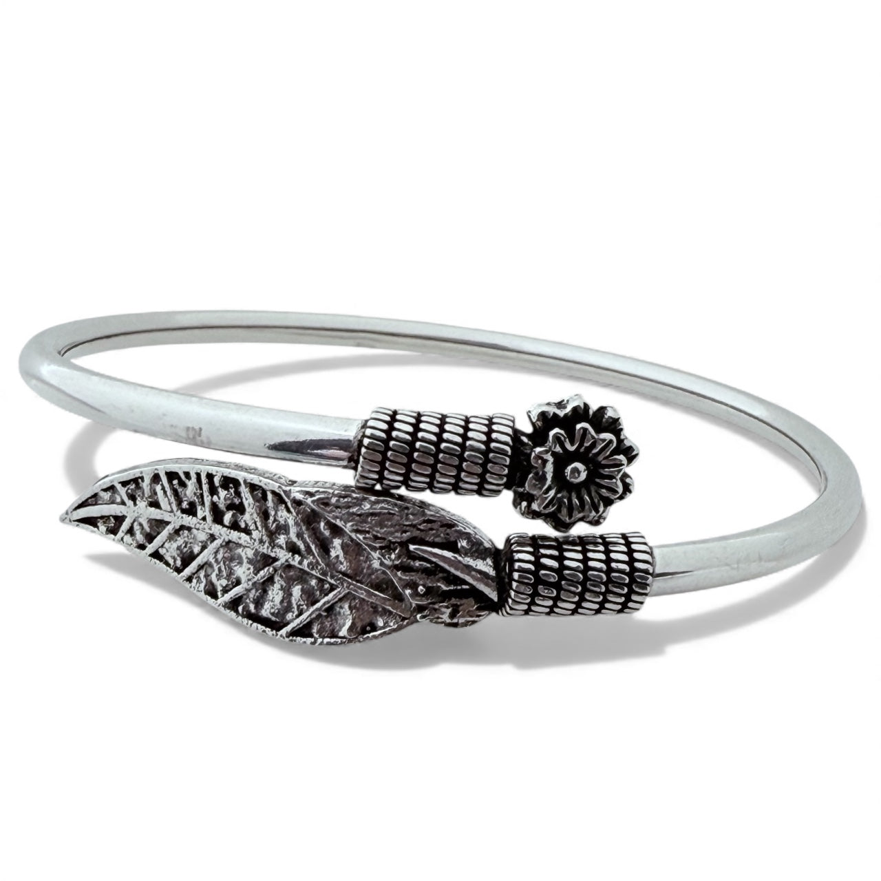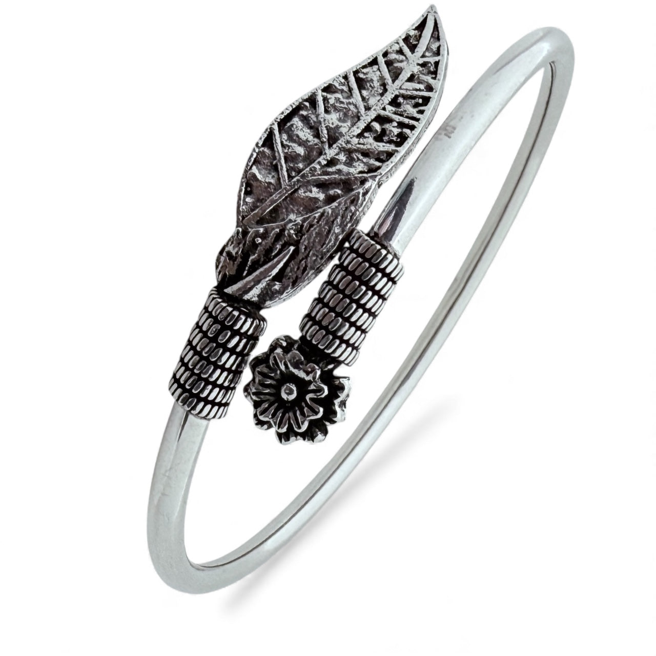 Leaf Flower Kada – 925 Silver Adjustable Bracelet, 16g, Floral Design