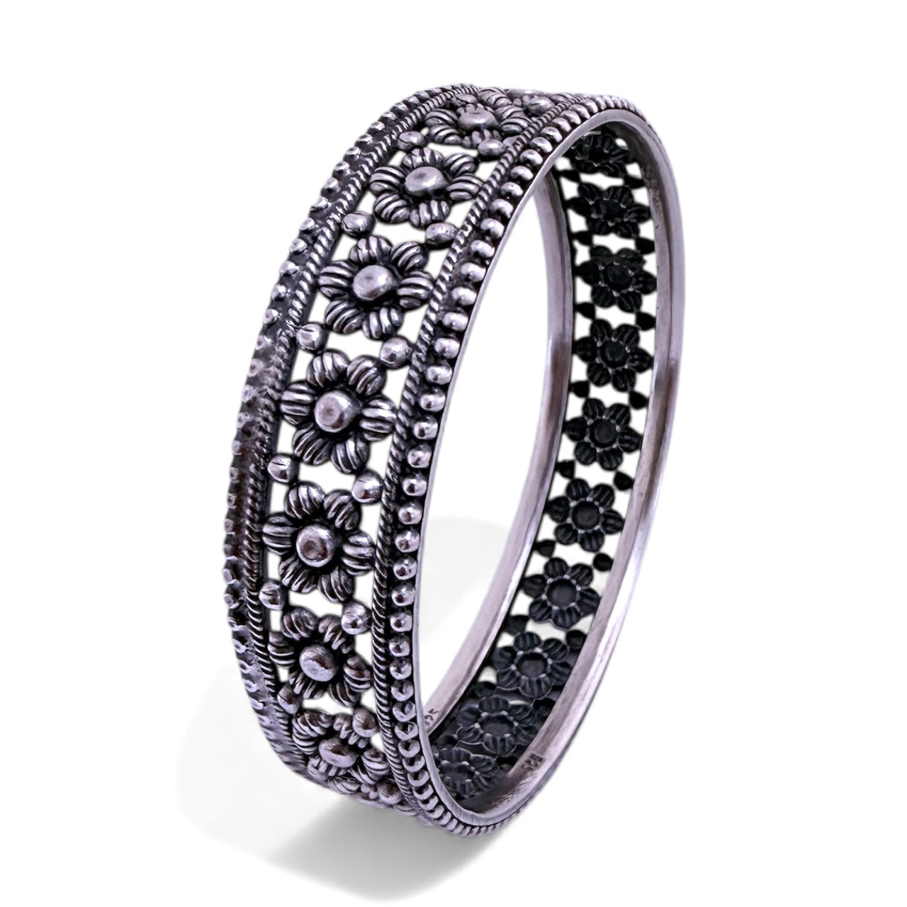 how off your love for elegance with this lightweight 925 silver bangle featuring a bold, openwork floral design. Weighing just 44 grams, this statement piece is meticulously handcrafted, perfect for girls and women as a unique accessory for daily, party, or festive occasions.
