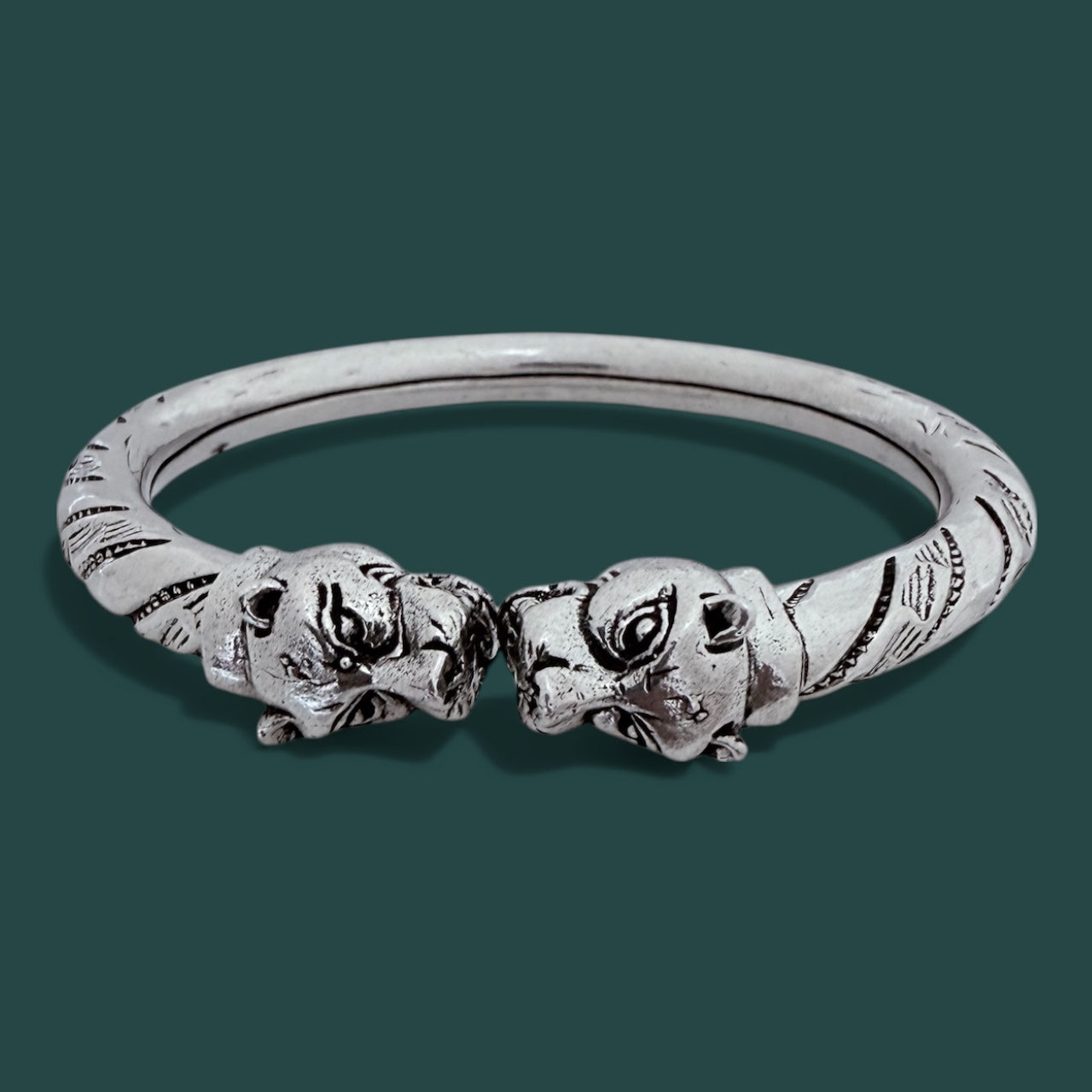 Bring strength and style together with this hollow twist kada in oxidised antique 925 silver, finished with bold lion faces at both ends. Weighing 31.5 grams, this handcrafted unisex bracelet makes a powerful statement for men and women looking to elevate their festive or daily looks.