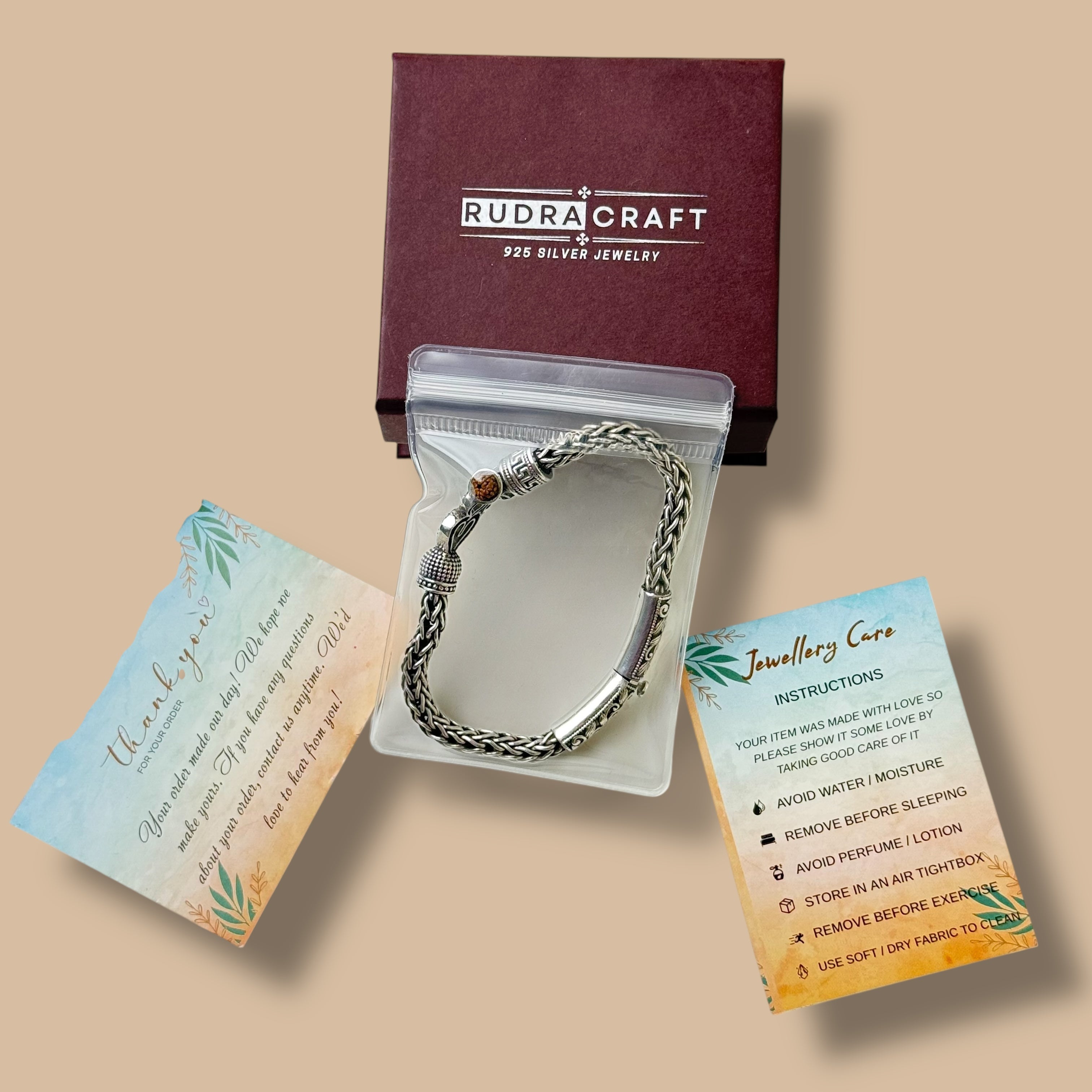 Celebrate spiritual style and strength with this men’s bracelet, beautifully handcrafted in pure 925 silver and weighing a substantial 44g. The centerpiece features an intricately carved Om symbol with a Rudraksha bead, flanked by ethnic patterns and beadwork. The flexible, woven chain is finished in antique oxidised silver, highlighting each detail and ensuring a premium ethnic look. Perfect for daily wear, festive occasions, or gifting, this bracelet combines devotion, tradition, and rugged masculinity. Ships in an exclusive Rudra Craft gift box with jewellery care card."