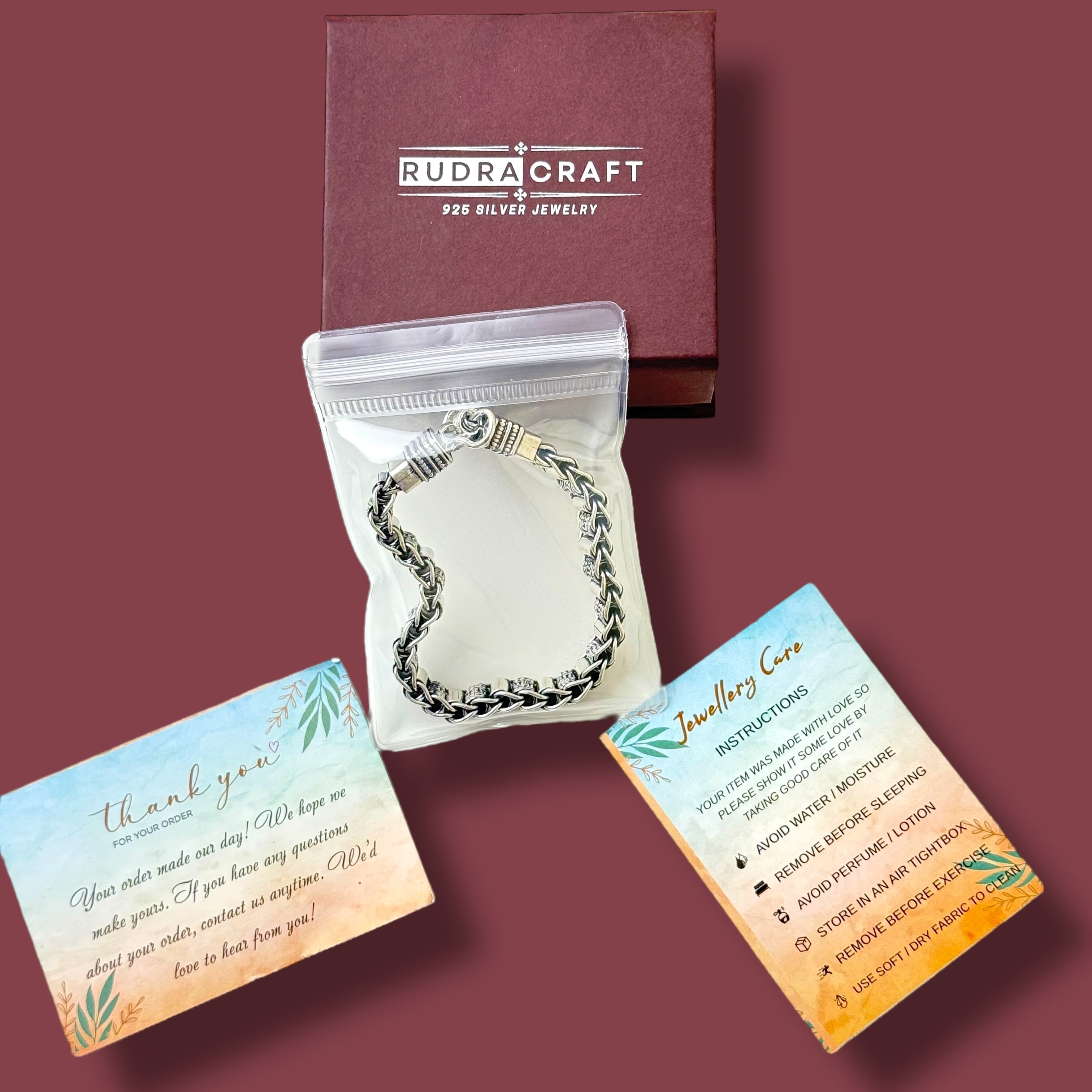 Make a bold style statement with this heavy men’s bracelet, handcrafted in pure 925 sterling silver and weighing 44g. Featuring eye-catching square links with intricate antique oxidised motifs, this bracelet exemplifies premium craftsmanship and robust design. Ideal for daily wear, festive occasions, or presenting as a unique gift, it delivers strong masculine appeal and lasting durability. Each piece ships in an exclusive Rudra Craft gift box with a jewelry care card.
