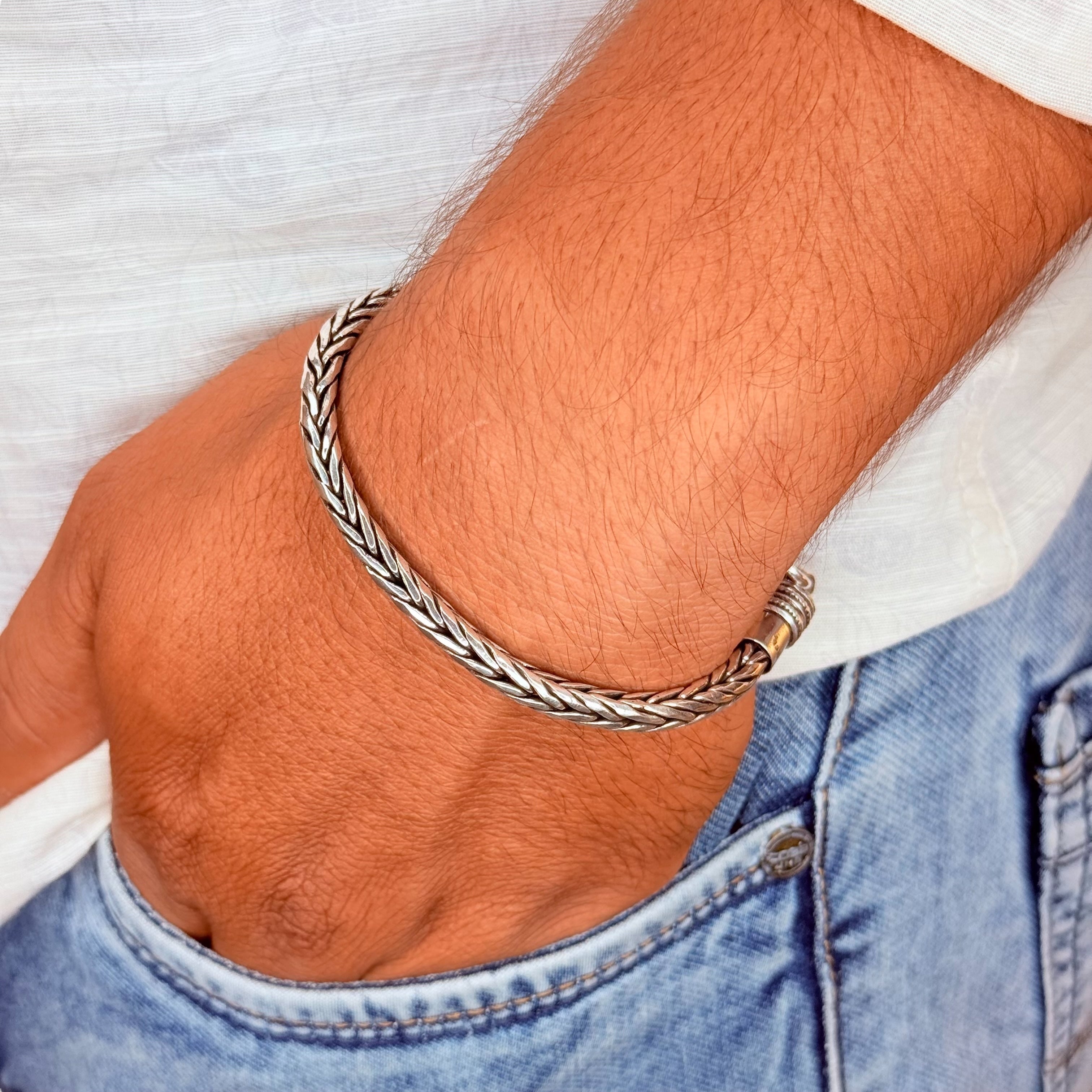 Make a bold statement with this heavy wheat chain bracelet, handcrafted for men in pure 925 silver and weighing 32.2g. The thick, intricate wheat pattern is paired with sturdy, oxidised end caps and a traditional ethnic hook clasp for a premium look—ideal for daily, festive, or gifting occasions.