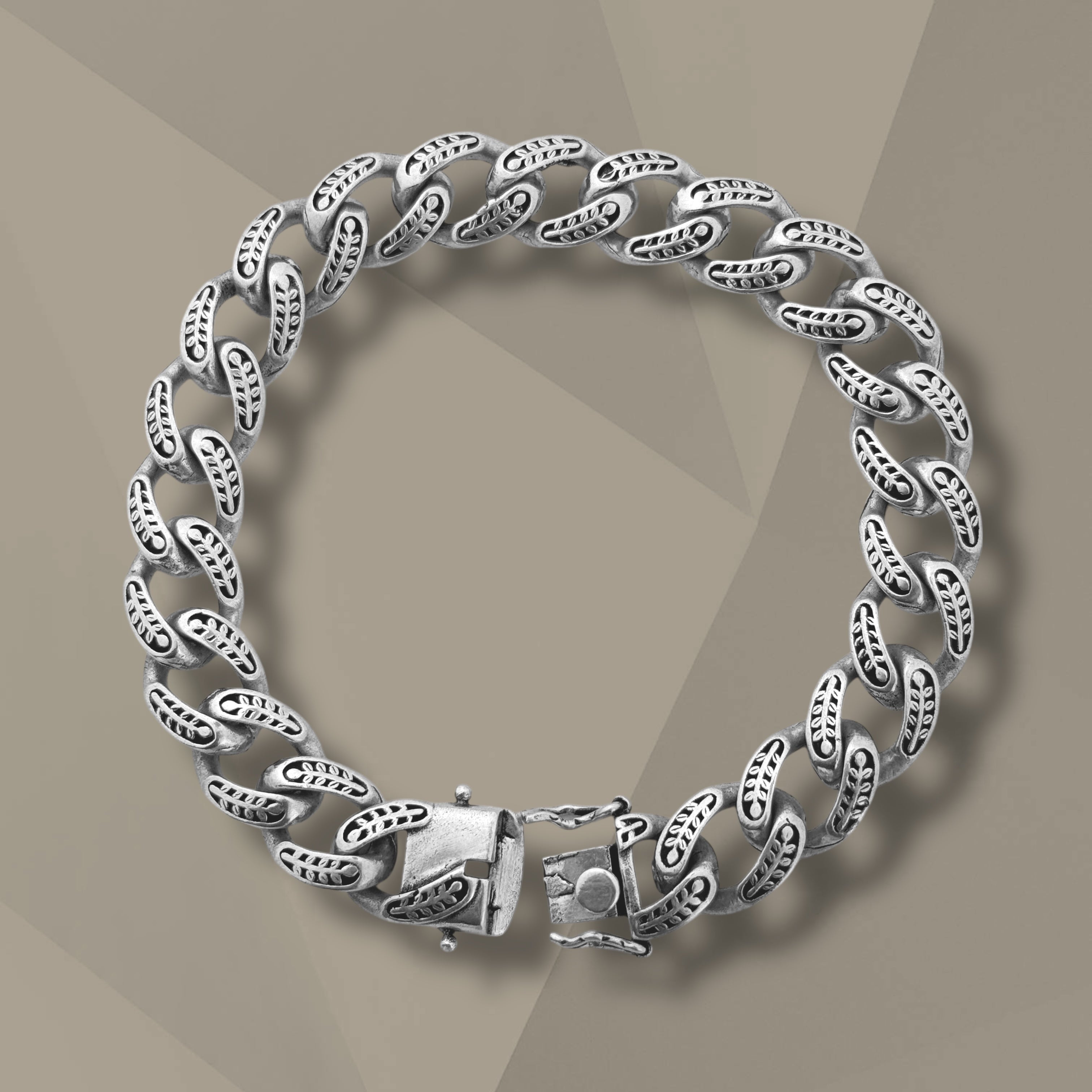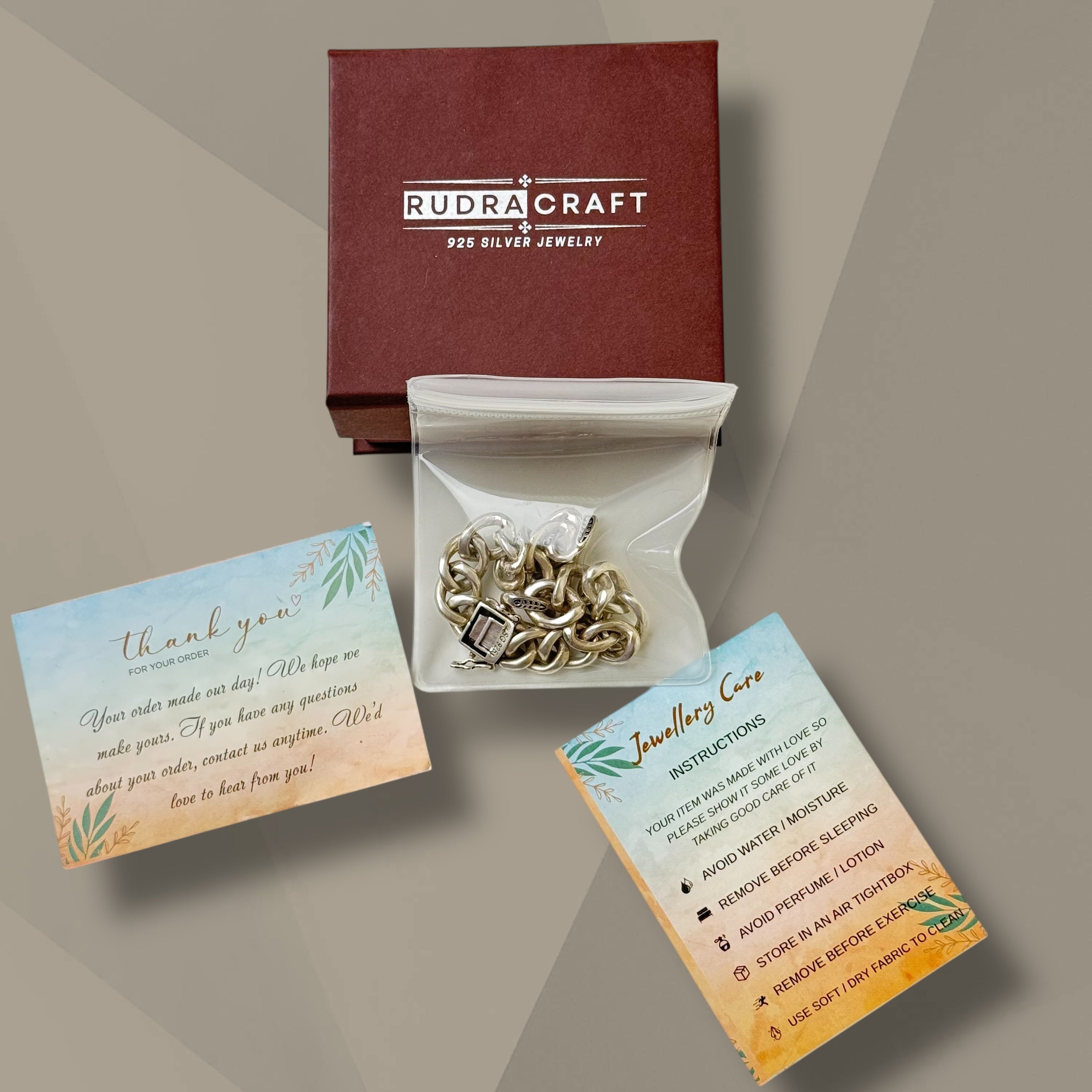 Make a bold style statement with this substantial men’s bracelet, handcrafted in pure 925 sterling silver and weighing 44.6g. Featuring classic, thick links with intricate antique oxidised detailing, this bracelet offers premium craftsmanship and a secure box clasp. Ideal for daily wear, festive occasions, or as a special gift, it delivers a robust, masculine appeal. Each piece ships in an exclusive Rudra Craft gift box with a jewelry care card."